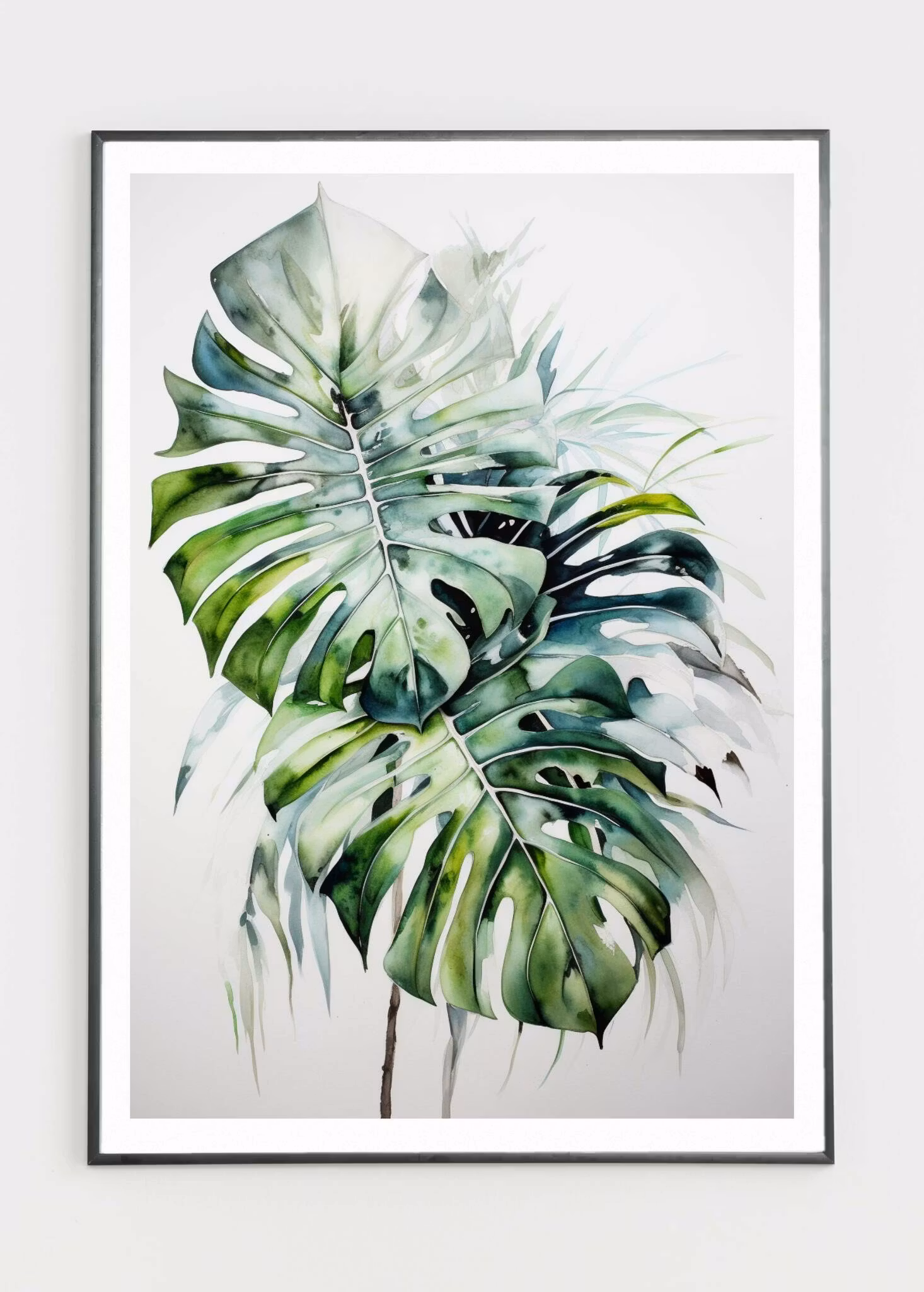 Viktor Johanssons akvarellmaleri feirer skjønnheten til en enslig monstera. Maleriet fanger de dype grønne fargene på bladene og de karakteristiske skinnende duggdråpene som kryper langs bladflatene. Med en nesten fotografisk presisjon og subtil sans for detaljer gir Johansson monstera en hengiven og tidløs skjønnhet.